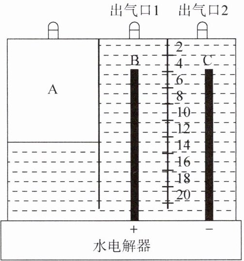 ② 用两个橡胶帽塞住右边两个出气口,用带针头的小注射器分别在出气口1和2处抽气,液面上升,直至水充满正负两极所在水槽;