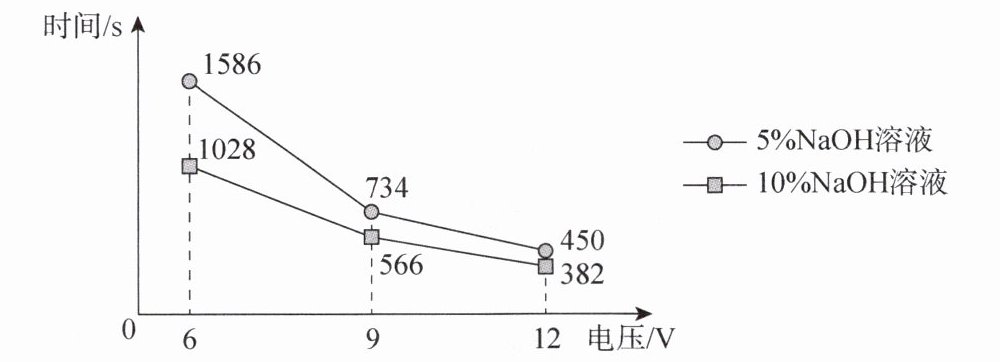 (3) 电解纯水速率较慢,为探究不同电压和不同浓度NaOH溶液对电解水速率的影响,小组同学进行多次实验,测得产生20mL氢气所需时间如下图所示。