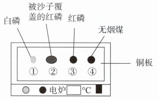 8. 用右图装置进行实验。升温至$60^{\circ}C$的过程中,仅①燃烧;继续升温至$260^{\circ}C$的过程中,仅③燃烧。下列分析不正确的是( )。