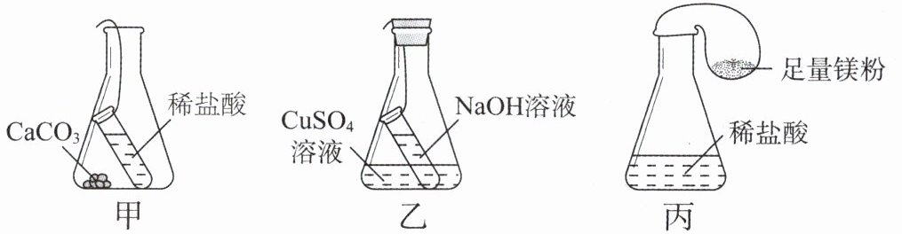 9. 甲、乙、丙三位同学用三个不同的实验来验证质量守恒定律。他们的方法是,先将如下页图所示的装置分别放在天平上调节至平衡,然后取下,将甲、乙试管中的液体与锥形瓶中的物质混合,将丙气球中的镁粉倒入锥形瓶中充分反应后,再放在各自的天平上,下列结论正确的是( )。