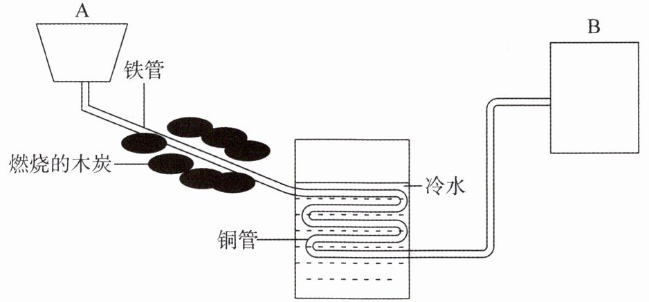 16. 拉瓦锡曾利用下页图装置探究水的组成:往$A$杯中滴加少量的水,水通过灼热的铁管时发生汽化,水蒸气与灼热的铁反应,生成一种黑色固体$(Fe_{3}O_{4})$和“可燃空气”,将气体通过放在冷水中的铜管,在装置$B$中收集到纯净的“可燃空气”。最终,拉瓦锡证明了水是由两种元素组成的。