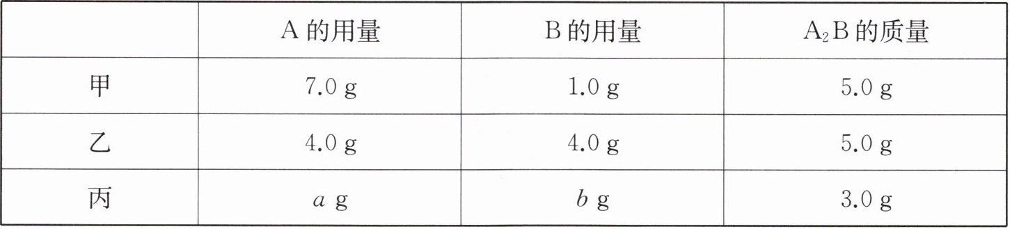 12. 金属单质$A和非金属单质B可生成A_{2}B$,反应的化学方程式为$2A + B = A_{2}B$。某校课外小组的甲、乙、丙三个学生分别在实验室内做该实验,充分反应时,所用$A和B的质量a和b$各不相同,但总质量相等,都是$8.0g$。有关实验数据记录如下表所示。丙学生实验中$a : b$的值可能是( )。