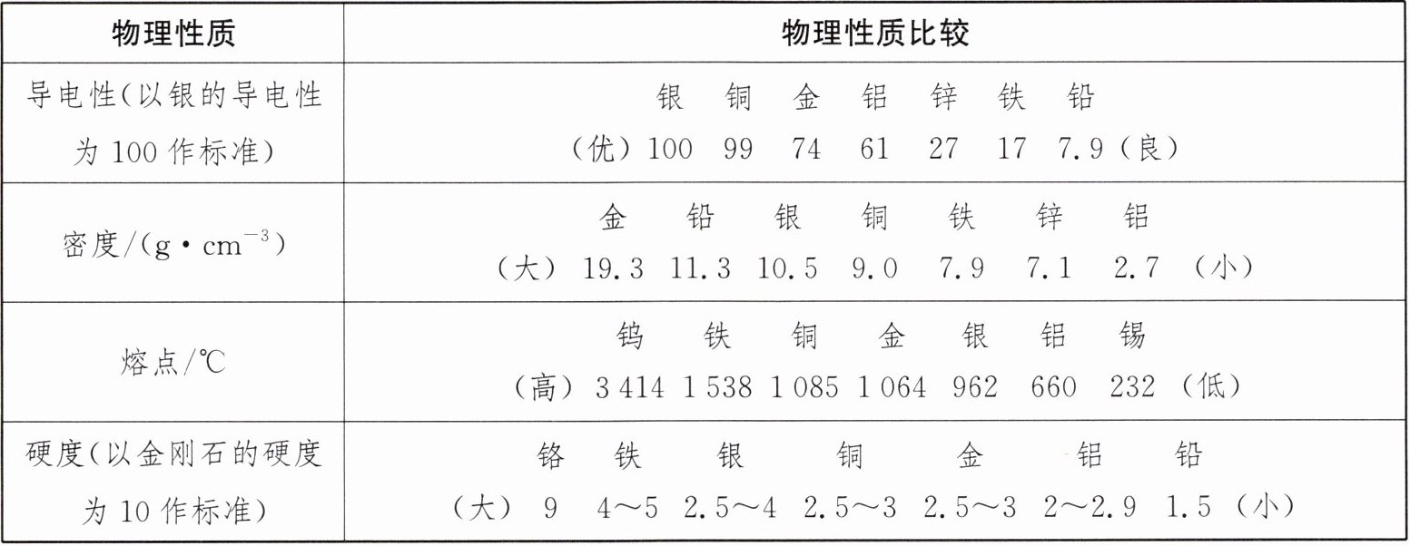 (1) 银的密度比铜大,价格也比铜高;钨的熔点高,锡的熔点低