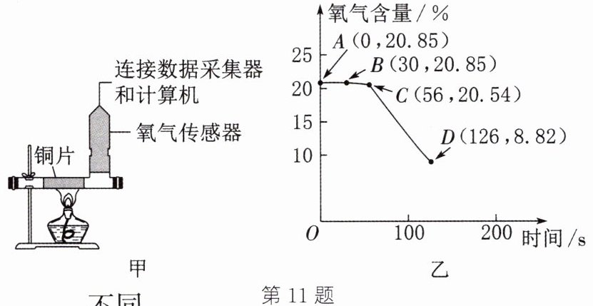 不同。(4)空气与过量铜片的反应如图甲。利用传感器测得装置内的“时间—氧气含量”曲线如图乙。该实验能证明铜与氧气发生了化学变化的证据有