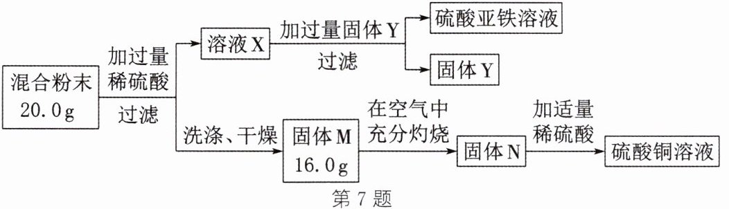 7. 实验室有一包铜和铁的混合粉末,某学习小组为测定其中铁的含量,并制取硫酸亚铁溶液和硫酸铜溶液,进行了如图所示的实验探究。下列说法正确的是(资料:氧化铜与稀硫酸反应生成易溶于水的硫酸铜和水,氧化亚铁或氢氧化亚铁与稀硫酸反应生成易溶于水的硫酸亚铁和水) (