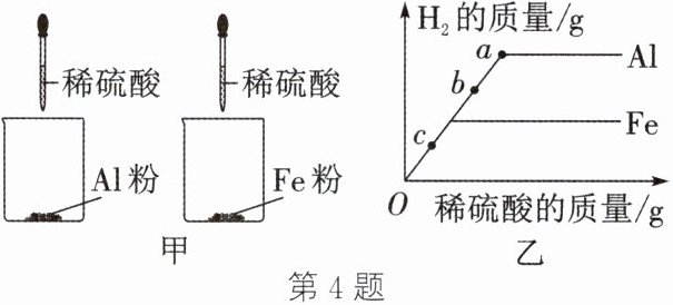 4.(2023·潍坊改编)如图甲,向两个盛有相同质量铝粉和铁粉的烧杯中,分别滴加相同浓度的稀硫酸,产生氢气的质量与加入稀硫酸的质量关系如图乙所示。下列说法正确的是 (