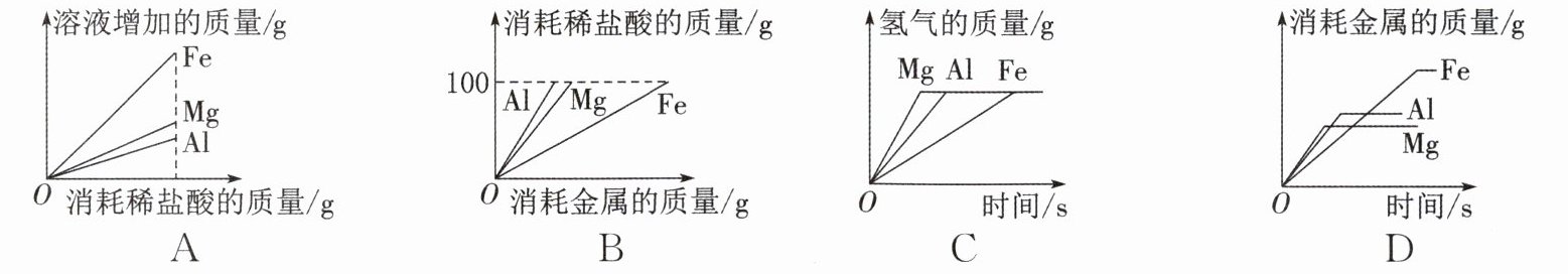 D 解析:足量的Mg、Al、Fe三种金属与浓度相同的100g稀盐酸反应,稀盐酸完全反应,当消耗的稀盐酸的质量相等时,参与反应及生成的各物质的质量关系分别为Mg+2HCl=MgCl₂+H₂↑;2Al+6HCl=2AlCl₃+3H₂↑;Fe+2HCl=FeCl₂+H₂↑,参与反应的HCl质量相等时,由以上关系可得出:三种生成物的质量大小关系为FeCl₂>MgCl₂>AlCl₃,则反应后溶液增加的质量关系为Fe>Mg>Al,A的图像正确。参与反应的金属质量相同时,Fe、Mg、Al消耗的HCl的质量关系为$\frac{73}{56}:\frac{73}{24}:\frac{73}{18}$,所以质量相同的三种金属消耗的稀盐酸的质量关系为Al>Mg>Fe,B的图像正确。Fe、Mg、Al三种金属的活动性顺序为Mg>Al>Fe,则它们与稀盐酸反应的速率大小关系为Mg>Al>Fe,稀盐酸未完全反应时,镁反应的速率最大,相同的时间内产生氢气的质量最大,铁反应的速率最小,相同的时间内产生氢气的质量最少。稀盐酸不足时,产生氢气的质量由酸的质量决定,三种金属产生氢气的质量相等,C的图像正确。反应结束后,三种金属消耗的稀盐酸质量相等,由以上质量关系可得出:完全反应后消耗的金属质量关系为m(Fe):m(Mg):m(Al)=56:24:18,所以参加反应的Fe的质量最大,Mg次之,Al最小,D的图像错误。