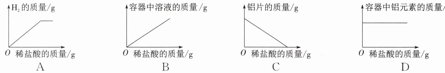 2. 取一定量打磨后的铝片放入某容器中,再逐渐加入稀盐酸。下列加入稀盐酸的质量与有关量的变化关系图错误的是 (
