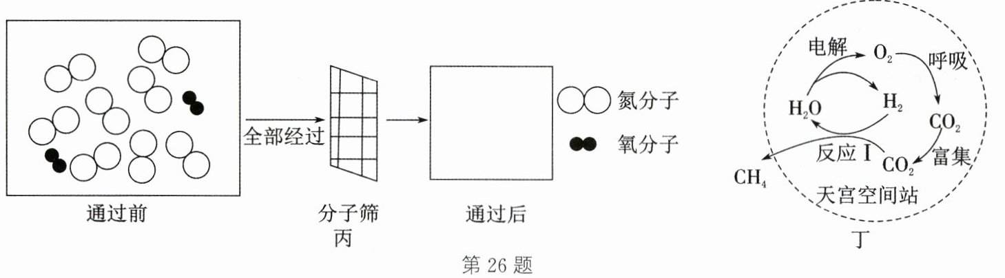 (8) 某品牌家庭制氧机是利用分子筛制氧,空气经过分子筛时氮气被吸附,氧气通过,获得高浓度的氧气。其微观示意图如图丙,请在图丙中画出通过后的微观粒子示意图。