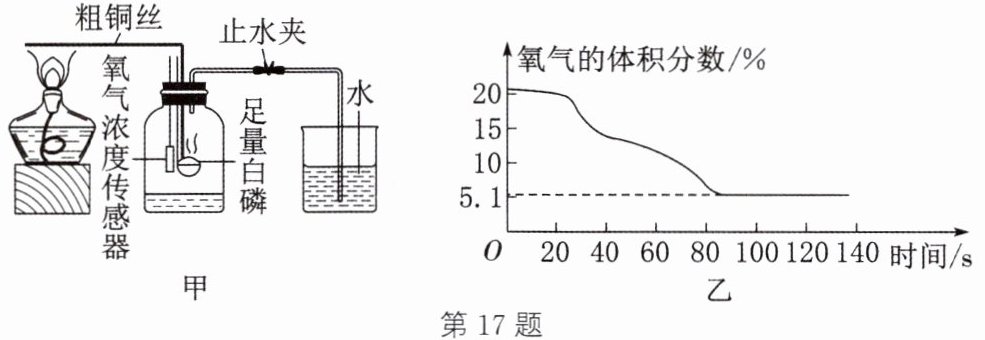 17. (2023·杭州改编)小金利用如图甲所示装置(气密性良好)和试剂测定空气中氧气的体积分数,集气瓶中空气的体积为200mL,氧气浓度传感器测得集气瓶内氧气的体积分数变化曲线如图乙所示。(已知:白磷在空气中着火燃烧的最低温度是40℃,生成物与红磷燃烧产物相同)