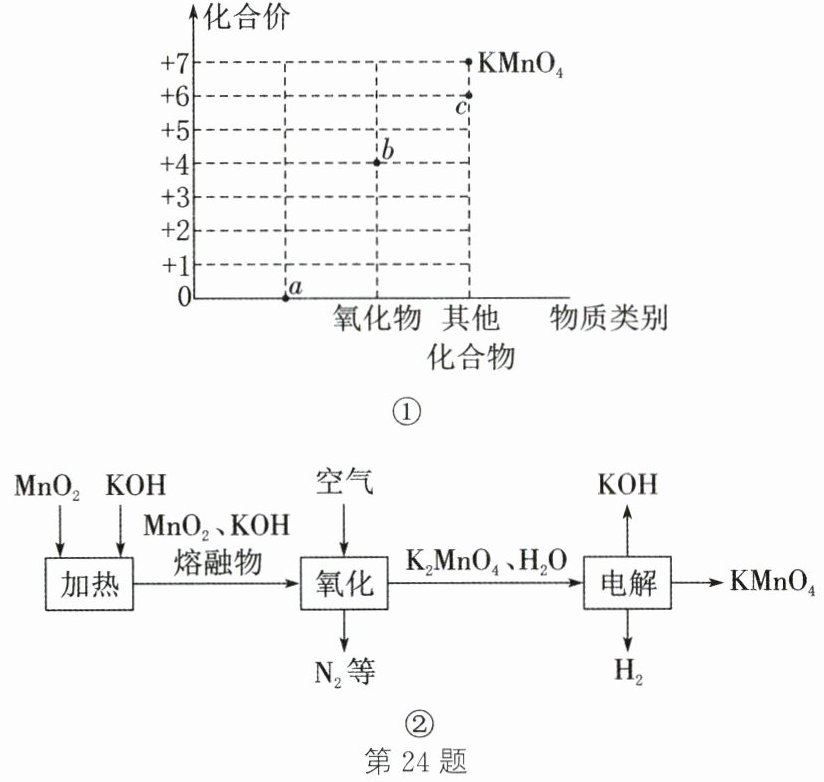 24. (7分)高锰酸钾是一种重要的化工产品。有关锰元素的"化合价与物质类别"对应关系如图①所示,制取高锰酸钾的工艺流程如图②所示。