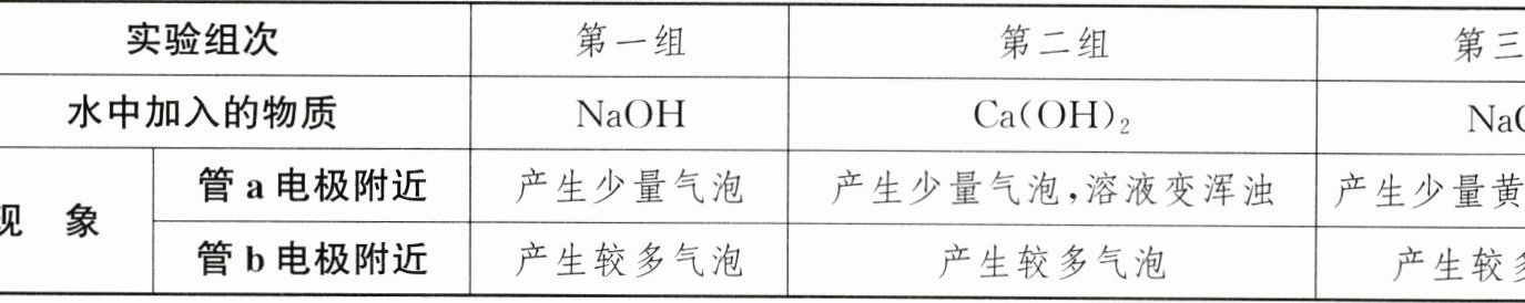 为研究电解水时增强导电能力的方法,分别向水中加入少量NaOH、$Ca(OH)_2$和NaCl,搅拌至充分溶解,利用如图乙所示装置分别进行了电解水实验,实验结果如表: