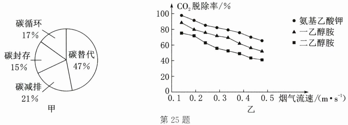(2) 膜吸收法吸收CO₂可实现碳封存。研究人员通过实验比较了氨基乙酸钾、一乙醇胺、二乙醇胺三种不同的膜吸收剂对烟气中CO₂的脱除效果,其结果如图乙所示。据图乙可得出的结论是在实验研究的烟气流速范围内,