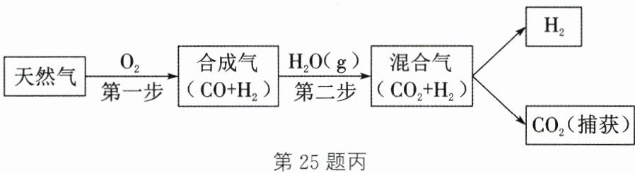 。(3) 燃烧前捕集技术是将燃料转化成清洁气体能源,把二氧化碳在燃烧前就分离出来。一种以天然气(主要成分是CH₄)为燃料的"燃烧前捕获系统"的简单流程如图丙所示CH₄在催化剂的作用下实现第一步转化,写出反应的化学方程式: