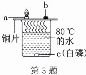 3. C 解析:白磷、红磷的着火点分别为40℃、240℃,a处物质能燃烧,a处物质为白磷,故选项A的说法正确;b处物质没有燃烧,b处物质是红磷,红磷与氧气接触,但没有燃烧,说明红磷的着火点高于80℃,故选项B的说法正确;铜片上的白磷燃烧,红磷不燃烧,说明燃烧需要温度达到可燃物的着火点,故选项C的说法错误;c处通入氧气,已满足燃烧的三个条件,水中的白磷能燃烧,故选项D的说法正确。