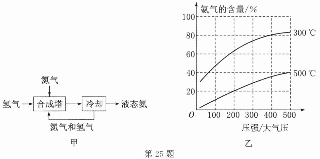 Ⅰ. 从空气中获得氮气,进行氨气的合成。氨气是一种重要的化学物质,可用于制造硝酸和氮肥。工业合成氨气的流程如图甲所示,在铁催化的作用下,用体积比为1∶3的氮气和氢气合成氨气,当容器中氨气的含量不再发生变化时(平衡时),测得氨气的含量分别与温度和压强的关系如图乙所示。