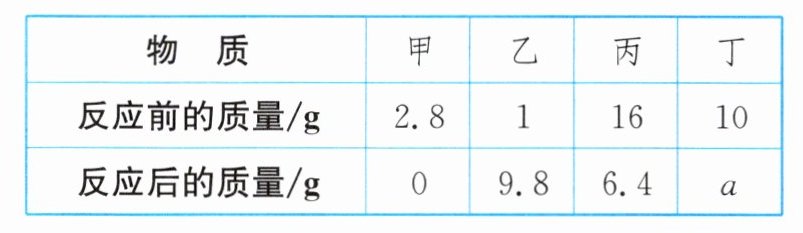 C 解析:分析表中数据知,反应后甲的质量减少了2.8g-0g=2.8g,故甲是反应物,参加反应的质量为2.8g;同理可以确定乙是生成物,生成的质量为9.8g-1g=8.8g;丙是反应物,参加反应的质量为16g-6.4g=9.6g;由质量守恒定律知,丁应是生成物,且生成的质量为2.8g+9.6g-8.8g=3.6g,故a=10+3.6=13.6,故选项A、B的说法正确。该反应的反应物为甲和丙,生成物是乙和丁,生成物是两种,不符合“多变一”的形式,不属于化合反应,故选项C的说法错误。甲、乙发生改变的质量比为2.8g:8.8g=7:22,故选项D的说法正确。