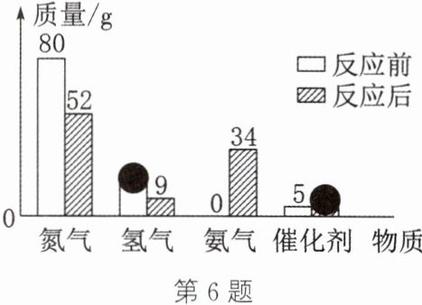 6.(2024·河北改编)当前,氨气$(NH_3)$的能源化应用逐渐成为研究热点。工业上常用氮气和氢气合成氨气,一定条件下,在密闭容器中加入反应物和催化剂进行该反应,反应前后各物质的质量如图所示,图中有两处被墨迹遮盖。下列说法正确的是 (