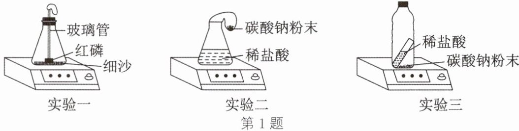 (1)实验一:称量装置和药品的总质量为$m_1$且保持装置密闭;使红磷燃烧,待装置冷却后,再次称量装置和药品的总质量为$m_2。$$m_1$与$m_2$的大小关系是$m_1$