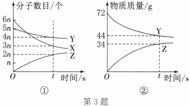 C 解析:由图①可知,X 和 Y 是反应物,Z 是生成物,根据反应前后分子数目的变化情况,该反应可表示为 3X+Y=2Z,该反应属于化合反应,因此生成物 Z 一定是化合物,A 的说法正确;由图②可知,t min 时,参加反应的 Y 的质量为 72 g-44 g=28 g,生成 Z 的质量为 34 g,由质量守恒定律可知,参加反应的 X 的质量为 34 g-28 g=6 g,则参加反应的 X 与 Y 的质量比为 6 g:28 g=3:14,B 的说法正确;由反应的化学方程式 3X+Y=2Z 可知,反应前后分子总数发生改变,C 的说法错误;设 Y、Z 的相对分子质量分别为 p、q,则$\frac{p}{2q}=\frac{28\ \text{g}}{34\ \text{g}}$,解得$\frac{p}{q}=\frac{28}{17}$,D 的说法正确。