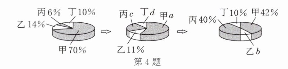 4. 在密闭容器中有甲、乙、丙、丁四种物质,在一定条件下使之发生化学反应,测得反应前及反应过程中的两个时刻各物质的质量分数如图所示,a、b、c、d分别表示相应物质的质量分数。下列数据正确的是 (