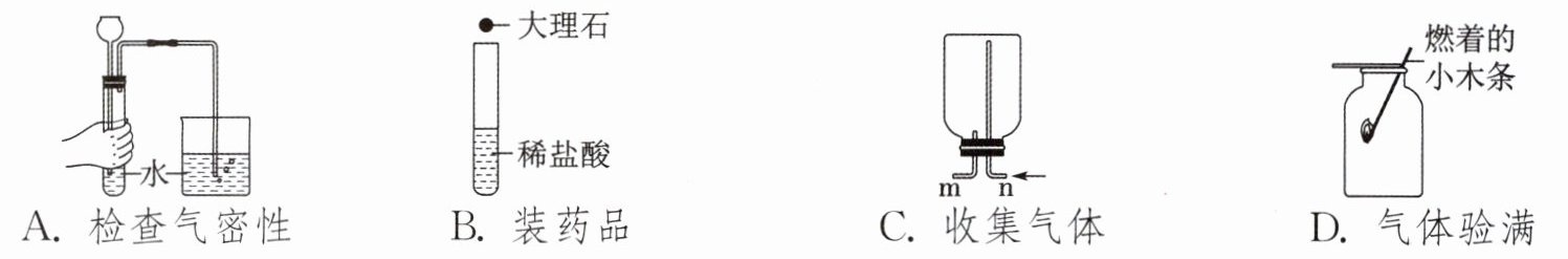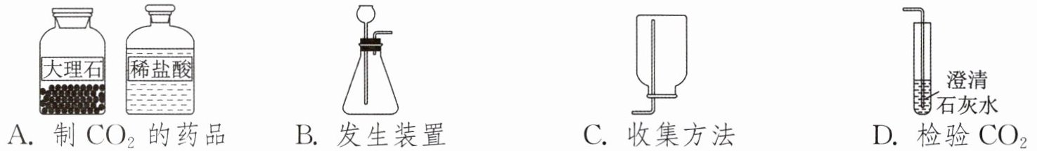 1.(教材P154练习与实践第2题变式)下列关于$CO_2$的实验室制取及检验的药品或装置不正确的是(