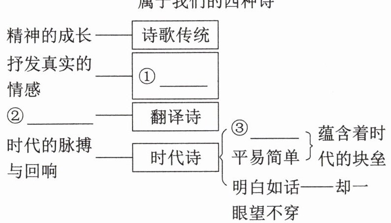 5. ① 白话诗 ② 世界异彩纷呈的诗歌花园 ③ 警策精炼 6. 这句话运用了比喻的修辞,把时代的发展比喻成脉搏,表现了诗作与时代生活一同起伏变化,反映着时代的发展,是当代人对时代的回应。 7. 这部分不能删去。这部分运用插叙手法,作者回忆大学时期对李少君老师的不熟悉,表现当时的懵懂,与后文知晓《诗刊》是国内最重要的诗歌刊物形成对比,烘托内心的惊喜,为后文与《诗刊》结缘,想在《诗刊》上发表诗歌作了铺垫。 8. 示例:第⑦段的分行,是诗歌朗读的停顿点,每一次停顿,给人思考遐想的空间。全诗因为分行停顿,形成了反复、排比的句式。通过“就是……的人”的句式,作者丰富了对“诗人”写诗的目的和意义的探讨;“为……而写”的句式,将“诗人”身上的责任感展现出来;两个“穿行”的句式,表现“诗人”的思想自由,不受时间和空间的约束。