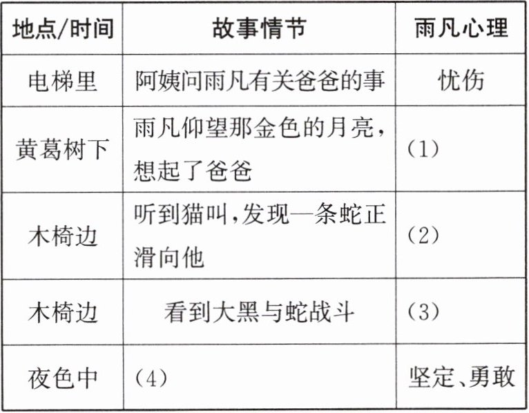 3.(1)倍感孤独(2)意外惊恐 (3)着急 (4)雨凡和妈妈谈心 4.(1)这句话是对自然环境的描写,运用了拟人的修辞手法,写出了夜晚的祥和美好,与雨凡的孤单形成对比,同时也为后文雨凡发现蛇的惊慌、意外作铺垫。(2)这些动词生动地描写了大黑猫与黄蛇战斗的场面,表现出战斗的激烈和大黑猫的勇猛,这一幕使雨凡深受影响,促进了他的成长转变。 5. 示例:不赞同。本文主人公虽然是雨凡,但他正是因为看到流浪猫们与蛇战斗时的勇猛无畏才发生成长转变;喂流浪猫是爸爸对雨凡爱的传递,同时也是雨凡怀念爸爸的一种方式;“月光下的流浪猫”具有画面感,能够吸引读者阅读,增强文章美感。 6. 示例:他们都经历了生活的困境,都在孤独中因为某种经历而成长。雨凡看到流浪猫勇猛战斗、自己养活自己的情形,流浪猫的独立、坚强影响着雨凡,促使他勇敢面对现实,瞬间成长。杜小康在家庭困境下辍学放鸭,面对孤独和迷茫,在搏击暴风雨中成长。