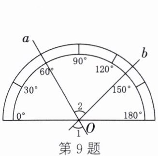 9. (2023·兰州改编)如图,直线a,b相交于点O,将量角器的中心与点O重合,发现表示60°的刻度线在直线a上,表示135°的刻度线在直线b上,则∠1的度数为______.