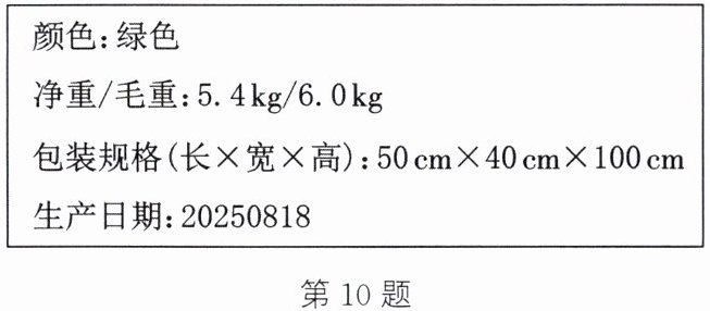 10.(新情境·现实生活)如图所示为某商品包装盒上标签的部分内容,请你根据该内容确定这个商品包装盒的质量与体积.