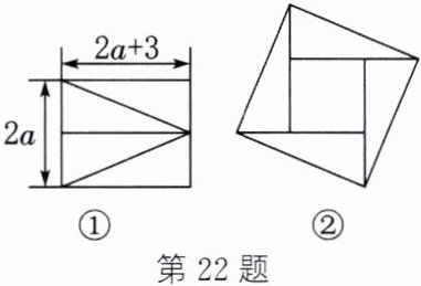 22. (新考法·综合与实践)如图①,将长为$2a+3$、宽为2a的长方形分割成四个完全一样的直角三角形,拼成包含大小两个正方形的图②.
