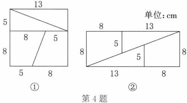 4. (新考法·探究题)小明有一张边长为 13 cm 的正方形纸片(如图①),他想将其剪拼成一张一边的长为 8 cm 的长方形纸片. 他想了一下,不一会儿就把原来的正方形纸片剪拼成了一张长21 cm、宽 8 cm 的长方形纸片(如图②),你认为小明剪拼得对吗?请说明理由.