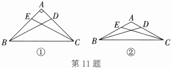 (2)如图②,在△ABC中,90°<∠BAC<180°,AB= AC,点D,E分别在边AC,AB上. 若CE= BD,则线段AE与线段AD相等吗?如果相等,请给出证明;如果不相等,请说明理由.