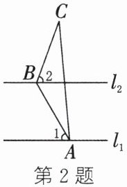 2. (新情境·现实生活)(2024·泗阳模拟)如图$,l_1//l_2,$点A在直线$l_1$上,点B在直线$l_2$上,AB= BC,∠C= 25°,∠1= 60°,则∠2的度数是 ( )