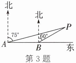 3. (新情境·现实生活)(2024·沭阳段考)如图,一艘轮船在某海域上由西向东匀速航行,在A处测得小岛P在北偏东75°方向上,继续向东航行12海里到达B处后,在B处测得小岛P在北偏东60°方向上,则轮船在B处时与小岛P的距离为海里.