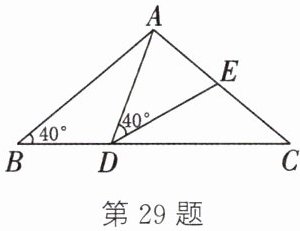 29. 如图,在△ABC中,AB= AC= 2,∠B= 40°,点D在线段BC上运动(不与点B,C重合),连接AD,作∠ADE= 40°,DE交线段AC于点E.