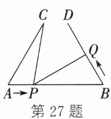 27. (2024·宿城段考)如图,AB= 4 cm,AC= BD= 3 cm,∠CAB= ∠DBA= 60°,点P在线段AB上以1 cm/s的速度由点A向点B运动,同时,点Q在线段BD上由点B向点D运动.设它们运动的时间为t s,点Q的运动速度为x cm/s.若△ACP与△BPQ全等,则x的值为______.