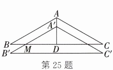 25. (2024·临夏改编)如图,在△ABC中,AB= AC= 2,∠BAC= 120°,将△ABC沿其底边的中线AD向下平移,使点A的对应点A'满足AA'= AD, A'B'与BD的交点为M,则B'M的长为______.