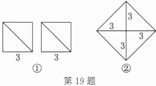 19. (新考法·探究题)将两块边长均为3的小正方形纸板按如图①所示的方式剪开,拼成如图②所示的一块大正方形纸板,你能求出这块大正方形纸板的面积吗?如果能,请写出它的面积.它的边长是有理数吗?如果不是,那么请你估计它的边长在哪两个相邻的整数之间.