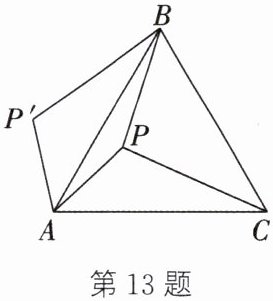 13. 如图,P 是等边三角形ABC 内的一点,$PA= 6$,$PB= 8$,$PC= 10$.若$P'是\triangle ABC$外的一点,且$\triangle P'AB\cong\triangle PAC$,求点 P 与点$P'之间的距离及\angle APB$的度数.