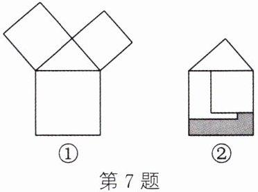 7. 勾股定理在我国古算书《周髀算经》中早有记载. 如图①,以直角三角形的各边为边分别向外作正方形,再把较小的两个正方形按如图②所示的方式放置在最大的正方形内. 若知道图②中涂色部分的面积,则一定能求出 ( )