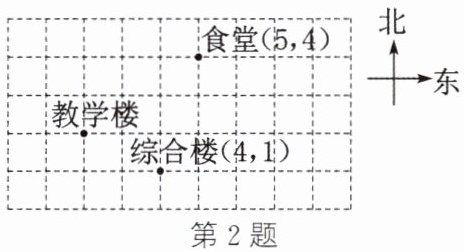 2.(新情境·现实生活)如图,这是一个利用平面直角坐标系画出的某学校的示意图. 若这个坐标系分别以正东、正北方向为x轴、y轴的正方向,且综合楼和食堂的坐标分别是$(4,1)和(5,4)$,则教学楼的坐标是( )