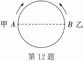12. (新考法·综合与实践)某校为培育青少年科技创新能力,举办了动漫制作活动,小明设计了点做圆周运动的一个雏形,如图,甲、乙两点分别从直径的两端点$A$、$B$按顺时针、逆时针的方向同时沿圆周运动,甲运动的路程$l(cm)与时间t(s)$满足关系:$l= \frac {1}{2}t^{2}+\frac {3}{2}t(t\geqslant 0)$,乙以$4cm/s$的速度匀速运动,半圆弧的长度为21 cm.