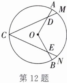 12. 如图,在$\odot O$中,$C是\overset{\frown}{ACB}$的中点,$D$、$E分别是OA$、$OB$上的点,且$AD = BE$,弦$CM$、$CN分别过点D$、$E$. 求证: