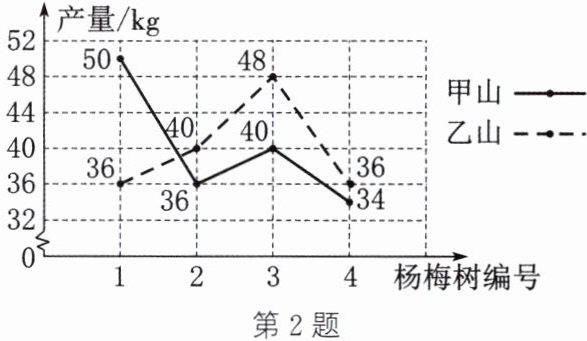2. 王伯伯几年前承包了甲、乙两座荒山,各栽100棵杨梅树,成活率为98%,现已挂果,经济效益初步显现.为了分析收成情况,他分别从两座山上随意各采摘了4棵树上的杨梅,每棵树的产量如折线统计图所示.