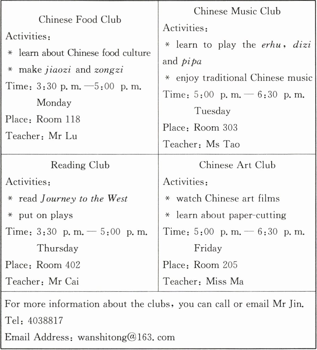 | * learn about Chinese food culture | * learn to play the erhu, dizi and pipa |