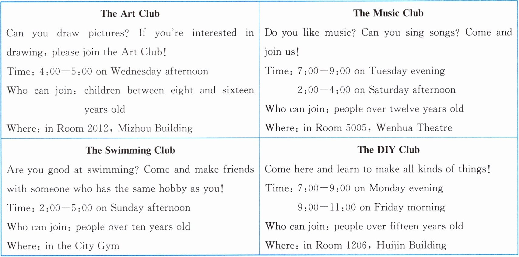 |Can you draw pictures? If you're interested in drawing,please join the Art Club!|Do you like music? Can you sing songs? Come and join us!|