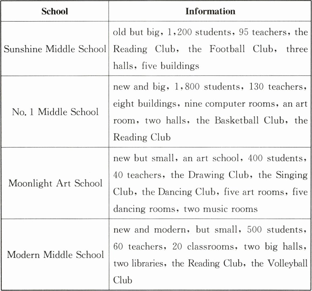| Modern Middle School | new and modern,but small,500 students,60 teachers,20 classrooms,two big halls,two libraries,the Reading Club,the Volleyball Club |