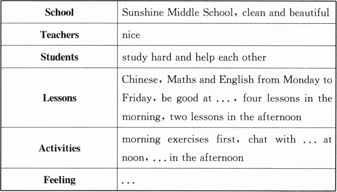 One possible version:My school lifeMy name is Tom. I study at Sunshine Middle School. It is clean and beautiful. The teachers are nice to us. The students study hard and help each other. I have Chinese,Maths and English lessons from Monday to Friday. I am good at English. I have four lessons in the morning and two in the afternoon. I do morning exercises first at school. I often chat with my friends at noon. I often play basketball with my classmates in the afternoon. I love my school life very much.
