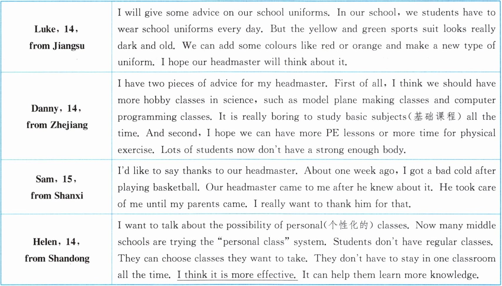 | Danny,14,from Zhejiang | I have two pieces of advice for my headmaster. First of all,I think we should have more hobby classes in science,such as model plane making classes and computer programming classes. It is really boring to study basic subjects(基础课程)all the time. And second,I hope we can have more PE lessons or more time for physical exercise. Lots of students now don't have a strong enough body. |